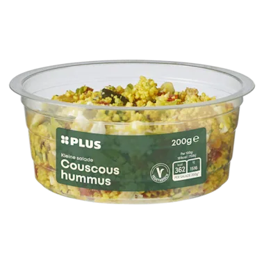 Ingrediënten :41% gegaarde volkoren couscous (volkoren durum TARWEGRIESMEEL, water, olijfolie, gedroogde groenten (ui, tomaat), lavasblad, conserveermiddel: E267, kurkuma, aroma, gistextract, maltodextrine, zonnebloemolie, lavaswortelextract, zout), 13% hummus (57% kikkererwten (kikkererwten, water, zout, antioxidant: E300), zonnebloemolie, SESAMPASTA, water, komijn, citroensap, knoflookpuree (knoflook, water, voedingszuur: citroenzuur, zout), zout, voedingszuur: citroenzuur/melkzuur, conserveermiddel: kaliumsorbaat, citroensap), 13% gegrilde groenten (courgette, aubergine, rode paprika, gele paprika), 10% rode paprika, 10% witte kaas (MELK, zout, zuursel, microbieel stremsel), 5% bosui, 5% zongedroogde tomatenstukjes (zongedroogde tomaat, zout), 1% munt, 0,5% peterselie, 0,5% bieslook.