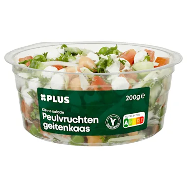 Ingrediënten :14% tomaat, 13% vinaigrette (plantaardige oliën (raapzaad, zonnebloem), water, natuurazijn, suiker, MOSTERD (water, MOSTERDZAAD, natuurazijn, zout, tijm, suiker, kurkuma, kaneel), VRIJE-UITLOOPKIPPENEI-EIGEEL, gedroogde ui, gemodificeerd maïszetmeel, zout, kruiden (rozemarijn, bieslook, majoraan), specerijen (knoflookpoeder, zwarte peper), stabilisator: xanthaangom, natuurlijk aroma, conserveermiddel: E202/E211), 12% gekookte bruine linzen (bruine linzen, azijn), 12% gekookte doperwten, 12% komkommer, 12% witte kool, 12% gekookte kikkererwten (kikkererwten, conserveermiddel: E267, zuurteregelaar: E500, zout, verdikkingsmiddel: xanthaangom), 9% geitenkaas (gepasteuriseerde GEITENMELK, antiklontermiddel: cellulose, zout, zuursel, conserveermiddel: E202, vegetarisch stremsel), 5% bosui, 1,4% peterselie.