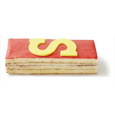 Schnitte gevuld met 38% slagroom en 3,8% kersen- en rode bessenmousse, bedekt met 19% rode marsepein en 1,0% gele decoratie met chocoladesmaak