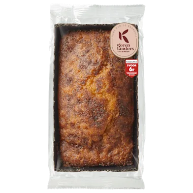 Ingrediënten: suiker, scharrelEI, TARWEbloem, roomboter (MELK), zonnebloemolie, 4,3% bruine bastardsuiker (suiker, invertsuikerstroop, kleurstof: E150a), glucosestroop, TARWEzetmeel, stabilisatoren: E420; E422, gemodificeerd maïszetmeel, rijsmiddelen: E450; E500, zout, 0,3% kaneel, conserveermiddelen: E202; E282, emulgatoren: E477; E472b, invertsuikerstroop, magere MELKpoeder, verdikkingsmiddel: E415, vanillearoma, kleurstof: E160a. Kan sporen van soja en noten bevatten.