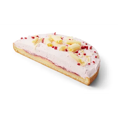 Vlaai met een laagje 10% gebonden frambozen, 29% bavaroise met frambozensmaak, gedecoreerd met 2,5% witte chocolade