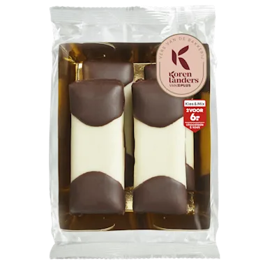 Cakelagen met 20% vulling met vanillesmaak en 13% frambozenbereiding, omhuld met 30% imitatiemarsepein op basis van sojabonen en abrikozenpitten en gedecoreerd met 9% cacaofantasie