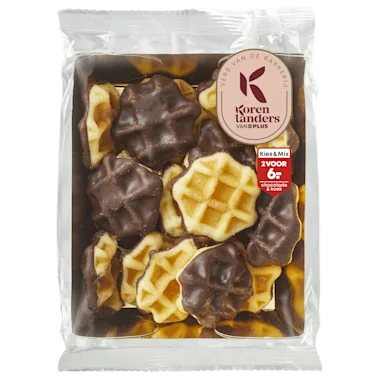 Ingrediënten :Suiker, 21% roomboter (MELK), TARWEBLOEM, SCHARRELEI, palmpitvet, TARWEZETMEEL, 3,0% pure chocolade (suiker, cacaomassa, cacaoboter, emulgator: SOJALECITHINE, natuurlijk vanillearoma), cacaopoeder, gemodificeerd zetmeel: E1414, weipoeder (MELK), SCHARRELKIPPENEI-EIWITPOEDER, koolzaadolie, zout, verdikkingsmiddel: xanthaangom, emulgator: E471/E472e/E481, conserveermiddel: E202, natuurlijk vanillearoma, kleurstof: carotenen.