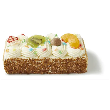 Cakelagen gevuld met witte topping op basis van melk en plantaardige olie en 4,8% frambozen-bessenmousse met 7% nougatine, gedecoreerd met slagroom, fruit en 1,6% suikerdecoratie