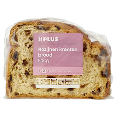 TARWEBLOEM, 32% rozijnen, water, 5% krenten, bakkersgist, TARWEGLUTEN, suiker, dextrose, bakkerszout, emulgator: E481/E472e (TARWE)/E471, geïnactiveerd TARWEDESEM, voorverstijfselde ROGGEBLOEM, weipoeder (MELK), wei-eiwit concentraat (MELK), plantaardige oliën (raapzaad, zonnebloem), SOJABLOEM, abrikoos, rijsmiddel: E500, natuurlijk aroma, TARWEMOUTMEEL, azijn, voedingszuur: E270, glucosestroop, aroma, enzym (TARWE), meelverbeteraar: E300/E920 (plantaardig), kleurstof: E100.