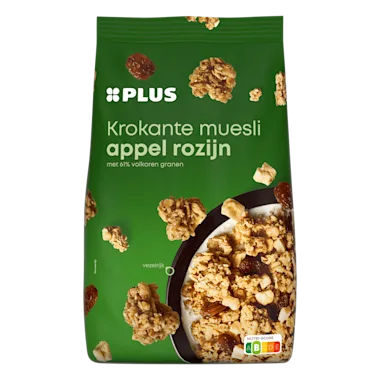 krokante muesli met rozijnen en gedroogde appelstukjes