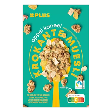 Ingrediënten :63% volkoren HAVERVLOKKEN, suiker, zonnebloemolie, cornflakes (maïs, suiker, zout, GERSTEMOUTEXTRACT, emulgator: lecithinen), 4% gesuikerde cornflakes omhuld met witte chocolade (suiker, maïs, cacaoboter, VOLLEMELKPOEDER, glazuur (glansmiddel: arabische gom, glucosestroop), zout, emulgator: SOJALECITHINE, GERSTEMOUTEXTRACT, natuurlijk vanillearoma), rijstkrokant (rijstgries, TARWEBLOEM, suiker, GERSTEMOUT, zout), 3% gedroogde appelstukjes, glucosestroop, geraspte kokos, 1,5% appelsapconcentraat, honing, kaneel, natuurlijk aroma, natuurlijk appelaroma met andere natuurlijke aroma’s, zout, vanille-extract, gekaramelliseerde suiker, antioxidant: E306.