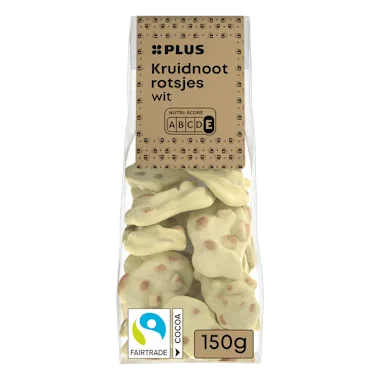 Ingrediënten :75% witte chocolade (suiker, cacaoboter, volle MELKPOEDER, weipoeder (MELK), emulgator: SOJALECITHINE, natuurlijk vanillearoma), 25% kruidnoten (TARWEBLOEM, suiker, plantaardige oliën (palm, raapzaad), specerijen, sinaasappelschil, rijsmiddel: E450/E500, gekaramelliseerde suiker zout, glucose-fructosestroop, emulgator: E322 (SOJA)).