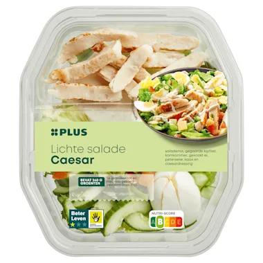 25% groentemix met peterselie (komkommer, tomaat, bosui, 3% peterselie), 25% slamix (ijsbergsla, romaine sla), 14% kipfilet (92% kippenvlees*, water, zout, maïszetmeel, dextrose, zuurteregelaar: E267), 13% caesardressing (water, raapzaadolie, maïszetmeel, geraspte kaas (MELK, aardappelzetmeel, zout, microbieel stremsel, zuursel (MELK)), MOSTERD (water, MOSTERDZAAD, natuurazijn, zout, natuurlijk kruidenaroma, kurkuma), VRIJE-UITLOOPKIPPENEI-EIGEELPOEDER, suiker, natuurazijn, zeezout, geconcentreerd citroensap, gistextract, ANSJOVISPUREE (ANSJOVIS, zout, zonnebloemolie), natuurlijke aroma's, verdikkingsmiddel: xanthaangom, specerijen (knoflookpoeder, zwarte peper), tijm), 10% komkommer, 10% gekookt EI (SCHARRELKIPPENEI*, zout, voedingszuur: E330/E331, conserveermiddel: E260), 4% kaas (gethermiseerde MELK, zout, microbieel stremsel).