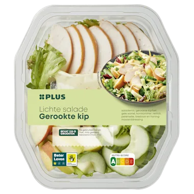 Ingrediënten :20% slamix (krulsla, lollo rosso, witte kool, radicchio rosso), 16% gerookte gesneden kipfilet (96% kipfilet*, zout, conserveermiddel: E250/E261, kaliumchloride, rook), 15% gele wortel, 14% komkommer, 13% appel (97% appel, antioxidant: E300/E302), 13% MOSTERD-HONINGDRESSING (water, raapzaadolie, 7% MOSTERD (water, MOSTERDZAAD, natuurazijn, zout, suiker, kurkuma, natuurlijk kruidenaroma), 4,0% bloemenhoning, suiker, natuurazijn, VRIJE-UITLOOP-EIGEELPOEDER, maïszetmeel, zout, geconcentreerd citroensap, verdikkingsmiddel: xanthaangom, conserveermiddel: E202, kurkuma, zwarte peperextract), 9% rettich, 0,7% peterselie, 0,7% bieslook.