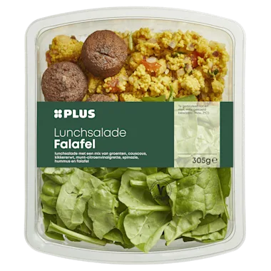 Ingrediënten :52% mix van groenten, couscous, kikkererwt en vinaigrette (61% groenten (53% tomaat, 32% gele peen, 15% rode ui), 19% gekookte volkoren couscous (48% volkoren durum TARWEGRIESMEEL, water, extra vergine olijfolie, kurkuma, aroma, gistextract, maltodextrine, gedroogde groenten (ui, tomaat), zonnebloemolie, lavaswortelextract, lavasblad, conserveermiddel: gebufferde azijn, zout), 14% gekookte kikkererwten (water, 46% kikkererwten, voedingszuur: citroenzuur), 6% munt-citroen-vinaigrette (water, raapzaadolie, azijn, kruiden (peterselie, munt), suiker, honing, geconcentreerd citroensap, zout, gemodificeerd zetmeel (maïs, aardappel), stabilisator: E415, sinaasappel, kurkuma), 20% spinazie, 15% hummus (57% kikkererwten (94% kikkererwten, water, zout, antioxidant: E300), zonnebloemolie, SESAMPASTA, water, komijn, knoflookpuree (knoflook, water, voedingszuur: citroenzuur, zout), zout, voedingszuur: citroenzuur/melkzuur, conserveermiddel: E202, citroensap (citroensap, conserveermiddel: E224, 14% falafel (55% gerehydrateerde kikkererwten, raapzaadolie, ui, paneermeel (TARWEBLOEM, TARWEZEMELEN, zout, gist, water), peterselie, specerijen (koriander, komijn, kurkuma, knoflook, chili), zout, rijsmiddel: E500, TARWEGLUTEN).