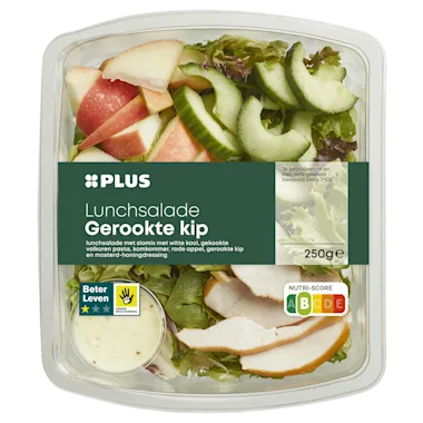 Ingrediënten :20% slamix met witte kool (krulsla, lollo rosso, 20% witte kool, radicchio rosso), 20% gekookte volkoren pasta (water, volkoren DURUMTARWEGRIESMEEL, koolzaadolie, voedingszuur: azijnzuur, zout), 20% komkommer, 18% rode appel (rode appel, antioxidant: E300/E302), 12% gerookte gesneden kipfilet (96% kipfilet*, zout, conserveermiddel: E250/E261, kaliumchloride, rook), 10% MOSTERD-HONINGDRESSING (water, raapzaadolie, 10% MOSTERD (water, natuurazijn, MOSTERDZAAD, zout, kurkuma), natuurazijn, 4% honing, suiker, geconcentreerd citroensap, stabilisator: xanthaangom, gemodificeerd aardappelzetmeel, SCHARRELKIPPENEI-EIGEEL, zout, zwarte peperextract, kurkuma, conserveermiddel: E202). *= Beter Leven keurmerk 1 ster.