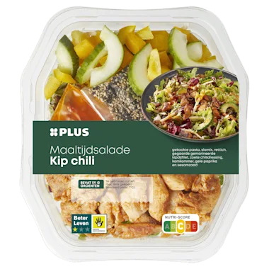 Ingrediënten :28% gekookte volkoren pasta (water, volkoren DURUMTARWEGRIESMEEL, koolzaadolie, voedingszuur: azijnzuur), 18% slamix (50% krulsla, 20% lollo rosso, 20% witte kool, 10% radicchio rosso), 15% gegaarde gemarineerde kipdijfilet (92% kippenvlees*, water, dextrose, zout, maltodextrine, zuurteregelaar: E500/E331/E267, aardappelzetmeel, specerijen (witte peper, piment, paprikapoeder, kurkuma, komijnzaad, karwijzaad, zoethout, gember), kruiden (korianderblad, fenegriek), natuurlijk aroma, verdikkingsmiddel: E407), 13% sweet chili dressing (water, suiker, natuurazijn, maïszetmeel, 3% sambal oelek (87% rode chilipeper, zout, voedingszuur: azijnzuur), zeezout, gedroogde paprika, koolzaadolie, gedroogde ui, gedroogde knoflook, conserveermiddel: E202, natuurlijk aroma, kleurstof: paprika-extract), 10% komkommer, 9% paprika, 6% rettich, 1,1% geroosterd SESAMZAAD.