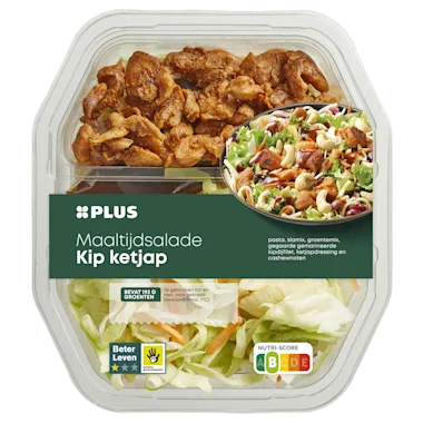 Ingrediënten :24% gekookte volkoren pasta (water, volkoren DURUMTARWEGRIESMEEL, koolzaadolie, voedingszuur: azijnzuur), 23% slamix (ijsbergsla, andijvie), 20% groentemix (spitskool, wortel, rettich), 16% gegaarde gemarineerde kipdijfilet (92% kippenvlees*, water, dextrose, zout, maltodextrine, aardappelzetmeel, zuurteregelaar: E267/E331/E500, specerijen (piment, paprikapoeder, kurkuma, karwijzaad, witte peper, komijnzaad, gember, zoethout), natuurlijk aroma, verdikkingsmiddel: E407, kruiden (fenegriek, korianderblad)), 13% ketjapdressing (water, natuurazijn, melasse, suiker, SOJASAUS (water, SOJABONEN, TARWE, zout), plantaardige oliën (SESAM, raapzaad, volledig geraffineerde soja), gemodificeerd maïszetmeel, specerijen (gember, rode peper, knoflookpoeder, paprikapoeder, uienpoeder), zout), 4% CASHEWNOTEN.