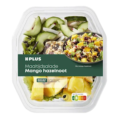 Maaltijdsalade met lollo bionda, mango, komkommer-radijsmix, een zakje citroen-maanzaad-srirachadressing, gekookte spelt en een zakje hazelnoot-cranberrymix