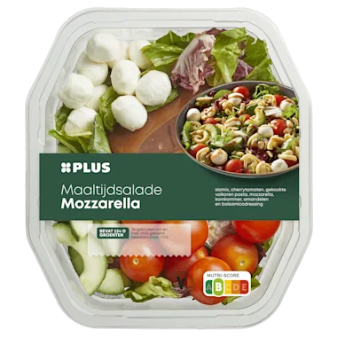 Ingrediënten :23% cherrytomaat, 20% slamix (romaine sla, rucola, radicchio rosso), 17% gekookte volkoren pasta met kruidenolie (volkoren DURUMTARWEGRIESMEEL, water, 2% kruidenolie (kruiden (basilicum, dragon), plantaardige oliën (olijf, zonnebloem), zout, knoflook), voedingszuur: azijnzuur, zout), 16% mozzarella (MELK, zout, voedingszuur: citroenzuur, microbieel stremsel), 11% balsamicodressing (zonnebloemolie, 30% balsamicoazijn (rode wijnazijn, druivenmost), water, geconcentreerd appelsap, suikerstroop, zout, specerijen (uienpoeder, knoflookpoeder, witte peper), stabilisator: xanthaangom), 9% komkommer, 4% AMANDELEN.