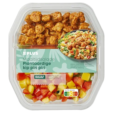 Ingrediënten :27% paprikamix, 25% slamix (frisee, ijsbergsla, radicchio rosso), 21% gekookte orzo (water, durum TARWEGRIESMEEL, voedingszuur: azijnzuur), 15% gemarineerde veganistische stukjes (voorgegaarde veganistische stukjes (water, eiwitconcentraat (fafabooneiwit, erwteneiwit), zonnebloemolie, zout, specerijen (kurkuma, chilipeper, paprikapoeder, korianderzaad, zwarte peper, komijnzaad, uienpoeder), conserveermiddel: E261, maltodextrine, dextrose), marinade (plantaardige oliën (raapzaad, zonnebloem), zout, specerijen (zwarte peper, groene peper, chilipeper, paprikapoeder, jalapeño peper, komijnzaad), gedroogde knoflook, gedroogde paprika, gedroogde tomaat, natuurlijke aroma's, paprikaconcentraat, kruiden (peterselie, oregano), voedingszuur: citroenzuur)), 12% dressing (water, suiker, plantaardige oliën (koolzaad, olijfpulp), sambal (rode chilipeper, voedingszuur: azijnzuur, zout, conserveermiddel: E202), natuurazijn, gemodificeerd maïszetmeel, gemodificeerd aardappelzetmeel, zout, conserveermiddel: E202/E211, verdikkingsmiddel: johannesbroodpitmeel/guarpitmeel), rode paprika, gedroogde ui, gedroogde knoflook, dextrose, knoflookpoeder, zuurteregelaar: E514, geleermiddel: E401, natuurlijke aroma's, antioxidant: E385).
