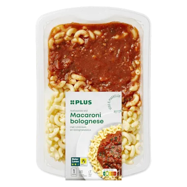 Ingrediënten :51% gekookte macaroni (water, TARWEGRIESMEEL, raapzaadolie), 49% bolognesesaus (34% tomaat, water, 12% gegaard rundvlees*, 8% tomatenpuree, 7% gezeefde tomaat, wortel, ui, gemodificeerd maïszetmeel, suiker, raapzaadolie, kruiden, natuurlijke aroma's (bevat SELDERIJ), rode wijn, zout, kaliumchloride, specerijen, gistextract).