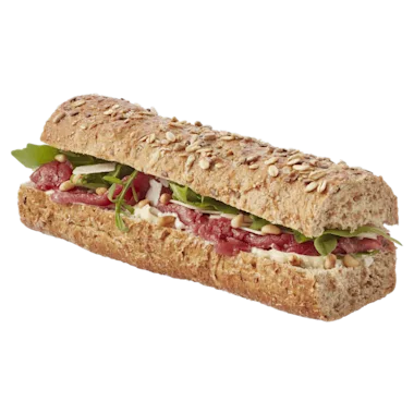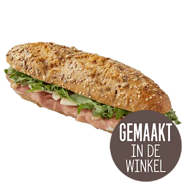 wit meergranenbroodje (TARWEBLOEM, water, zonnebloempitten, HAVERVLOKKEN, GERSTEMOUT, lijnzaad, SESAMZAAD, TARWEGLUTEN, bakkerszout (zout, kaliumjodide), ROGGEBLOEM, ROGGEZUURDESEMPOEDER, TARWEZUURDESEM, gekaramelliseerde suiker, dextrose, TARWEMOUT, gist, TARWEZETMEEL), rundercarpaccio, rucola, Grana Padano flakes (rauwe MELK, zout, conserveermiddel: E1105 (EI), stremsel), mayonaise met truffel (plantaardige oliën (raap, olijf), natuurazijn, water, SCHARRELKIPPENEI-EIGEEL, aroma’s (SELDERIJ, SOJA), vloeibare suiker, suiker, zout, MOSTERDZAAD, witte peper, truffel, champignongranulaat, conserveermiddel: E202, natuurlijk rozemarijn aroma), pijnboompitten.