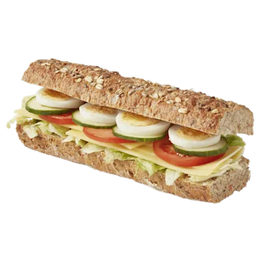 wit meergranenbroodje (TARWEBLOEM, water, zonnebloempitten, HAVERVLOKKEN, GERSTEMOUT, lijnzaad, SESAMZAAD, TARWEGLUTEN, bakkerszout (zout, kaliumjodide), ROGGEBLOEM, ROGGEZUURDESEMPOEDER, TARWEZUURDESEM, gekaramelliseerde suiker, dextrose, TARWEMOUT, gist, TARWEZETMEEL), tomaat, jong belegen kaas (gepasteuriseerde KOEMELK, zout, zuursel, vegetarisch stremsel, conserveermiddel: E251, kleurstof: carotenen), SCHARRELEI, komkommer, ijsbergsla.