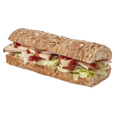 wit meergranenbroodje (TARWEBLOEM, water, zonnebloempitten, HAVERVLOKKEN, GERSTEMOUT, lijnzaad, SESAMZAAD, TARWEGLUTEN, bakkerszout (zout, kaliumjodide), ROGGEBLOEM, ROGGEZUURDESEMPOEDER, TARWEZUURDESEM, gekaramelliseerde suiker, dextrose, TARWEMOUT, gist, TARWEZETMEEL), kipfilet omhuld met kalkoenhuid (kipfilet, kalkoenhuid, zout, natuurlijke aroma's, glucose, azijn, conserveermiddel E250, zuurteregelaar: E327), ijsbergsla, barbecuesaus (tomatenpuree, ui, paprika, suiker, azijn, water, gemodificeerd maïszetmeel, zout, natuurlijk aroma (SOJA), ui-extract, korianderzaad, fenegriekzaad, voedingszuur: citroenzuur, conserveermiddel: E202).