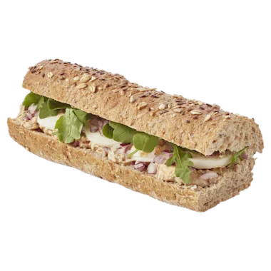 wit meergranenbroodje (TARWEBLOEM, water, zonnebloempitten, HAVERVLOKKEN, GERSTEMOUT, lijnzaad, SESAMZAAD, TARWEGLUTEN, bakkerszout (zout, kaliumjodide), ROGGEBLOEM, ROGGEZUURDESEMPOEDER, TARWEZUURDESEM, gekaramelliseerde suiker, dextrose, TARWEMOUT, gist, TARWEZETMEEL), tonijnsalade (gekookte tonijn (VIS), raapzaadolie, water, augurk, suiker, VRIJE-UITLOOPKIPPENEI-EIGEEL, azijn, maïszetmeel, geconcentreerde tomatenpuree, zout, gistextract, voedingszuur: citroenzuur, conserveermiddel: E202/E211, groente-extract, gemodificeerd maïszetmeel, verdikkingsmiddel: xanthaangom, MOSTERDZAAD, kleurstof: paprika-extract, stabilisator: johannesbroodpitmeel/guarpitmeel, geleermiddel: E407a, aroma, TARWEZETMEEL, aardappelzetmeel, kurkuma), SCHARRELEI, rucola, rode ui.