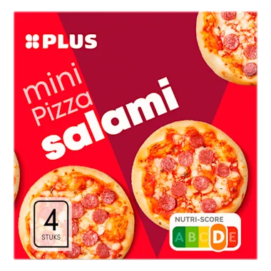 Voorgebakken minipizza's met tomatenpuree, kaas en salami, diepvries.