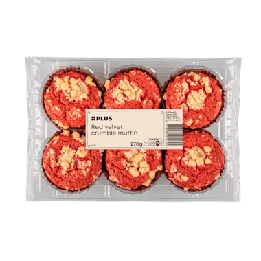 Red velvet muffin met 10% vulling met kwarksmaak en 10% kruimel