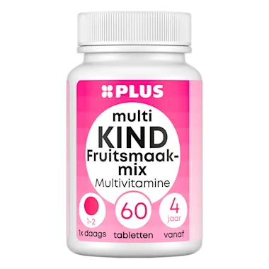 Plus Multi Kind kauwtabletten met fruitsmaak zijn samengesteld voor een goede aanvulling op de dagelijkse voeding tijdens de groei. Voor de normale groei en ontwikkeling van de botten bij jonge kinderen is vitamine D toegevoegd. Daarnaast zorgt vitamine D mede voor een goede weerstand bij kinderen. De vitaminen riboflavine en E dragen bij ter bescherming van gezonde cellen en weefsels.