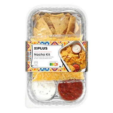 Pakket voor nacho’s met gezouten maïschips, mix van Goudse kaas en cheddar kaas, tomatendip met rode peper en zure roomdip met bieslook.