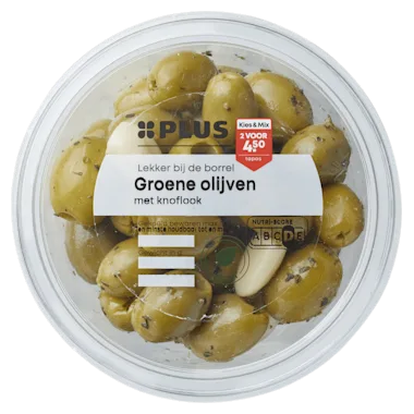 87% groene olijven, 8% knoflook, raapzaadolie, zout, voedingszuur: E330/E270, antioxidant: ascorbinezuur, azijn, knoflookpoeder, kruiden.