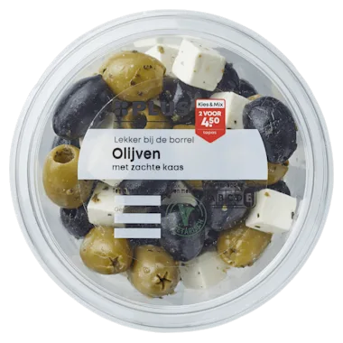 Ingrediënten :77% olijven (67% groene olijven, 29% zwarte olijven, zout, voedingszuur: E330/E270, antioxidant: E300, azijn, stabilisator: E579), 19% zachte kaas (MELK, zout, microbieel stremsel, zuursel), knoflook, raapzaadolie, kruiden, zout.