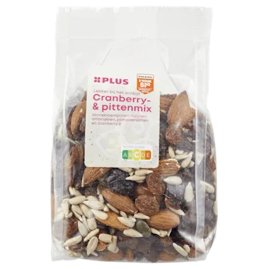 Ingrediënten :30% zonnebloempitten, 30% rozijnen (rozijnen, katoenzaadolie), 20% AMANDELEN, 10% gedroogde cranberry's gezoet met appeldiksap (appelsap uit concentraat, 35% cranberry, zonnebloemolie), 10% pompoenpitten.