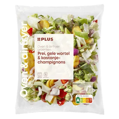 Ingrediënten :20% prei, 20% gele wortel, 17% kastanjechampignons, 17% rode ui, 13% paprika, 13% broccoli.