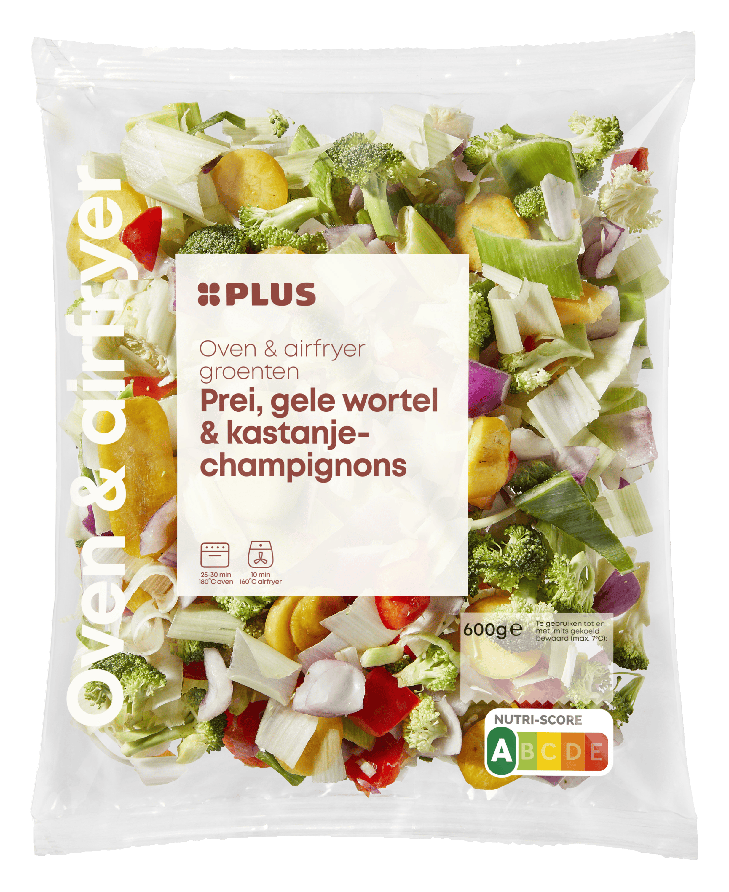 Ingrediënten :20% prei, 20% gele wortel, 17% kastanjechampignons, 17% rode ui, 13% paprika, 13% broccoli.