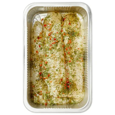 Pangasiusfilet zonder huid met 5% marinade en kruiden, ontdooid.