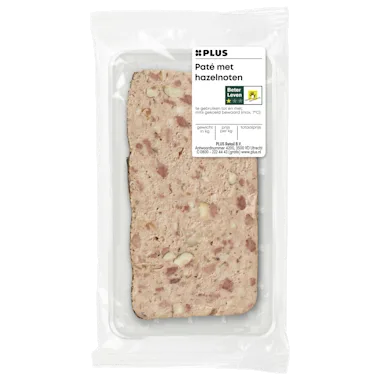 34% Varkenslever, varkensvet, 12% varkensvlees, MELK, varkensbindweefsel, 4% HAZELNOTEN, SCHARRELEI, nitrietpekelzout (zout, conserveermiddel: E250), voedingszuur: E262/E325; rijstbloem, suiker, gebakken ui, specerijen, honing, varkenseiwit, antioxidant: E300/E330; dextrose, natuurlijk aroma.