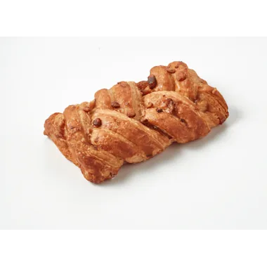 Diepgevroren gerezen bladerdeeg, rechthoekig gebak met vulling (20%) op basis van esdoornstroop (1%) en bestrooid met pecannoten(3%), klaar om te bakken.