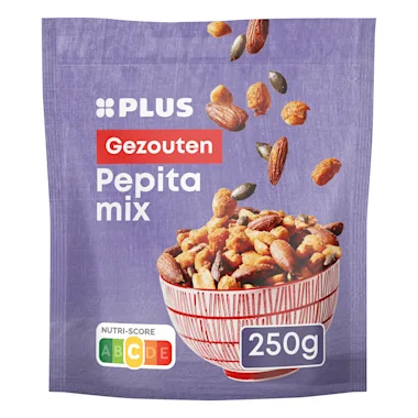 Mix van 33% gezouten en gebrande pinda’s, 22% gezouten en gebrande amandelen, 30% gecoate en gekruide pinda’s en 15% pompoenpitten