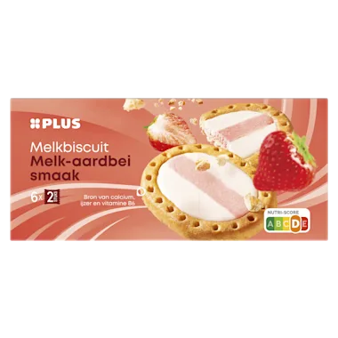 Biscuit met 27% melk- en aardbeismaakvulling met toegevoegd calcium, ijzer en vitamine B6.