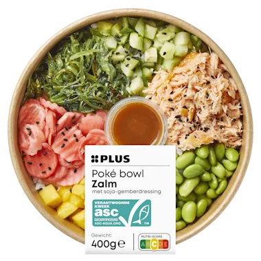 Ingrediënten :50% gekookte sushirijst (water, rijst, suiker, koolzaadolie, azijn, zout), 9% SOJABONEN, 8% warmgerookte zalm (zalm (Salmo salar*) (VIS), zout, conserveermiddel: E267, rook), 8% mango, 6% gezuurde radijs (radijs, azijn, zout, conserveermiddel: E211, zoetstof: E954, aroma), 6% zeewiersalade met agaragarstrips (zeewier, suiker, agar-agar strips, gedroogde paddenstoel, SESAMZAAD, sojasaus (water, SOJABONEN, TARWE, zout), SESAMOLIE, zout, rijstazijn, kleurstof: E101/E141, voedingszuur: E330, conserveermiddel: (E202, chilipeper), 6% komkommer, 6% soja-gember dressing (water, natuurazijn, suiker, raapzaadolie, 5% sojasaus (water, SOJABONEN, TARWE, zout), knoflook, melasse, zout, specerijen (uienpoeder, paprikapoeder, 0,3% gember), gemodificeerd maïszetmeel, natuurlijk aroma, verdikkingsmiddel: xanthaangom), 0,5% nigellazaad.