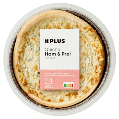 Ingrediënten :19% prei, TARWEBLOEM, SCHARRELKIPPENEI, roombereiding (room (MELK), emulgator: E471, stabilisator: E466/E407/E412), 10% ham (97% varkensvlees, zout, stabilisator: E451, conserveermiddel: E250), geraspte kaas (gepasteuriseerde MELK, aardappelzetmeel, zout, zuursel, microbieel stremsel), water, margarine (kokosvet, water, zonnebloemolie, emulgator: E471, zout, aroma, zuurteregelaar: E330), gepasteuriseerde halfvolle MELK, gemodificeerd maïszetmeel, zout, alcoholazijn, 0,3% preipoeder, gist, tomatenconcentraat, varkensgelatine, witte peper, nootmuskaat.