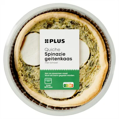 Ingrediënten :18% spinazie, TARWEBLOEM, SCHARRELKIPPENEI, water, 10% geitenkaas (gepasteuriseerde GEITENMELK, zout, zuursel, microbieel stremsel), margarine (kokosvet, water, zonnebloemolie, emulgator: E471, zout, aroma, zuurteregelaar: E330), gepasteuriseerde halfvolle MELK, tomaat, ui, kwark (gepasteuriseerde MELK, gepasteuriseerde room (MELK), zuursel, dierlijk stremsel), volle MELKPOEDER, raapzaadolie, gemodificeerd maïszetmeel, zout, alcoholazijn, varkensgelatine, gist, tomatenconcentraat, champignonpoeder (maltodextrine, champignonextract), witte peper, knoflookpoeder, nootmuskaat.