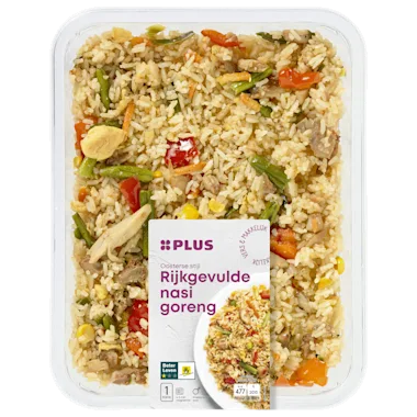 Ingrediënten :47% Gekookte rijst (water, witte rijst, volledig geraffineerde sojaolie), 12% gemarineerde gegaarde kip (91% kippendij*, suiker, ketjap (water, suiker, SOJA-EIWIT, kleurstof: karamel, zout, verdikkingsmiddel: E466, conserveermiddel: E202), tomatenpuree, hoisinsaus (witte suiker, water, gefermenteerde SOJAPASTA (water, zout, SOJABONEN, TARWEBLOEM), zout, gedroogde zoete aardappel, kleurstof: karamel, gemodificeerd maïszetmeel, gedehydrateerde knoflook, SESAMZAADPASTA, specerijen, gezouten chilipeper (chili, zout), voedingszuur: E260), gember, anijszaad, venkelzaad, peperkorrels, kaneel), 8% rode paprika, 6% sperziebonen, 4% VRIJE-UITLOOPKIPPENEI**, 4% ui, 4% wortel, 4% lente-ui, 4% maïs, oestersaus (water, suiker, zout, oesterextract (oester (WEEKDIEREN), water, zout), gemodificeerd maïszetmeel, kleurstof: karamel), volledig geraffineerde sojaolie, suiker, plantaardige oliën (raapzaad, SESAM), zout, gistextract (gistextract, zout, zonnebloemolie).