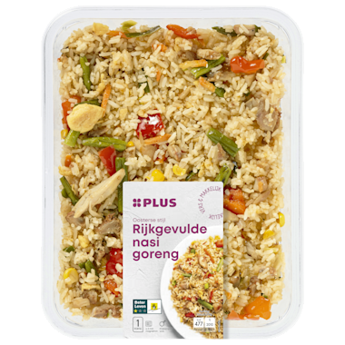 Ingrediënten :47% Gekookte rijst (water, witte rijst, volledig geraffineerde sojaolie), 12% gemarineerde gegaarde kip (91% kippendij*, suiker, ketjap (water, suiker, SOJA-EIWIT, kleurstof: karamel, zout, verdikkingsmiddel: E466, conserveermiddel: E202), tomatenpuree, hoisinsaus (witte suiker, water, gefermenteerde SOJAPASTA (water, zout, SOJABONEN, TARWEBLOEM), zout, gedroogde zoete aardappel, kleurstof: karamel, gemodificeerd maïszetmeel, gedehydrateerde knoflook, SESAMZAADPASTA, specerijen, gezouten chilipeper (chili, zout), voedingszuur: E260), gember, anijszaad, venkelzaad, peperkorrels, kaneel), 8% rode paprika, 6% sperziebonen, 4% VRIJE-UITLOOPKIPPENEI**, 4% ui, 4% wortel, 4% lente-ui, 4% maïs, oestersaus (water, suiker, zout, oesterextract (oester (WEEKDIEREN), water, zout), gemodificeerd maïszetmeel, kleurstof: karamel), volledig geraffineerde sojaolie, suiker, plantaardige oliën (raapzaad, SESAM), zout, gistextract (gistextract, zout, zonnebloemolie).