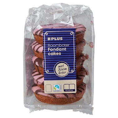 Roombotercakeje met vulling met bosvruchten, roze fondant coating en gekleurde suikerdecoratie