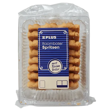 Krokante gespoten koekjes. Bereid met roomboter. Lekker bij koffie en thee.