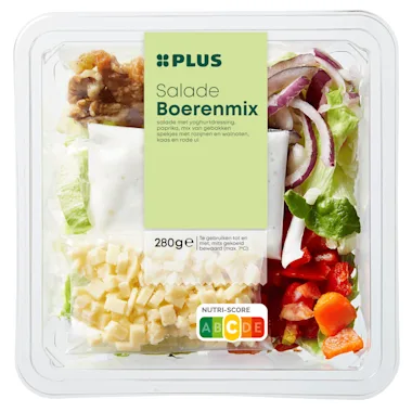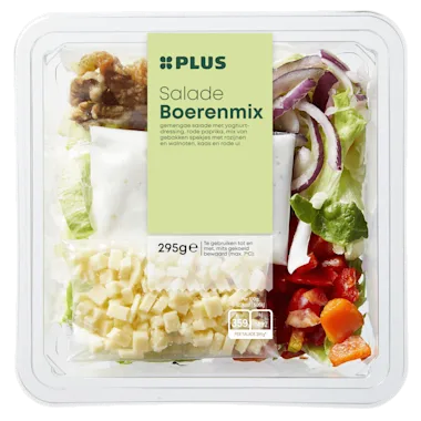 Ingrediënten :42% ijsbergsla, 18% yoghurtdressing (water, 26% magere yoghurt (MELK), koolzaadolie, natuurazijn, suiker, zeezout, MELKEIWIT, VRIJE UITLOOPKIPPENEIEIGEELPOEDER, natuurlijk aroma, verdikkingsmiddel: E412/E415, gistextract, maïszetmeel, peterselie, specerijen (uienpoeder, witte peper)), 16% paprika, 9% kaas (gepasteuriseerde MELK, zout, aardappelzetmeel, zuursel, stremsel), 9% mix van gebakken spekjes met rozijnen en walnoten (34% spek (varkensvlees, zout, zuurteregelaar: E326, conserveermiddel: E262/E250, rookaroma, antioxidant: E301), 33% WALNOTEN, 33% rozijnen (rozijnen (SULFIETEN), zonnebloemolie)), 6% rode ui.