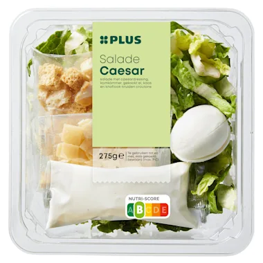 40% romaine sla, 18% caesardressing (water, koolzaadolie, maïszetmeel, geraspte kaas (gepasteuriseerde MELK, aardappelzetmeel, zout, microbieel stremsel, zuursel (MELK)), mosterd (water, MOSTERDZAAD, natuurazijn, zout, kurkuma, natuurlijk kruidenaroma), VRIJE-UITLOOPKIPPENEIEIGEELPOEDER, suiker, natuurazijn, zeezout, geconcentreerd citroensap, gistextract, ansjovispuree (ANSJOVIS, zout, zonnebloemolie), natuurlijke aroma's, verdikkingsmiddel: xanthaangom, specerijen (knoflookpoeder, peper), conserveermiddel: E202, tijm), 16% komkommer, 14% gekookt ei (gekookt SCHARRELEI, zout, voedingszuur: E330/E331, conserveermiddel: azijnzuur), 6% knoflook-kruiden croutons (croutons (TARWEBLOEM, zonnebloemolie, dextrose, TARWEGLUTEN, gist, zout, GERSTEMOUTEXTRACT, antioxidant: E300), zonnebloemolie, 2,5% knoflookgranulaat, 0,7% kruiden (peterselie, oregano, basilicum, majoraan, tijm, rozemarijn), zout), 6% kaas (gethermiseerde MELK, zout, microbieel stremsel).