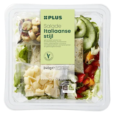 Ingrediënten :36% slamix (rode eikenbladsla, groene eikenbladsla, rucola), 21% basilicumdressing (water, raapzaadolie, suiker, natuurazijn, zout, maïszetmeel, spinaziepoeder, verdikkingsmiddel: xanthaangom, specerijen (knoflookpoeder, witte peper, kurkuma), 0,1% basilicum), 17% komkommer, 10% paprika, 8% mix van croutons, zonnebloempitten, pompoenpitten en gedroogde tomatenvlokken (30% croutons (TARWEBLOEM, zonnebloemolie, dextrose, TARWEGLUTEN, gist, zout, GERSTEMOUTEXTRACT), 30% zonnebloempitten, 25% gedroogde tomaat, 15% pompoenpitten), 8% kaas (gepasteuriseerde MELK, zout, zuursel, microbieel stremsel).